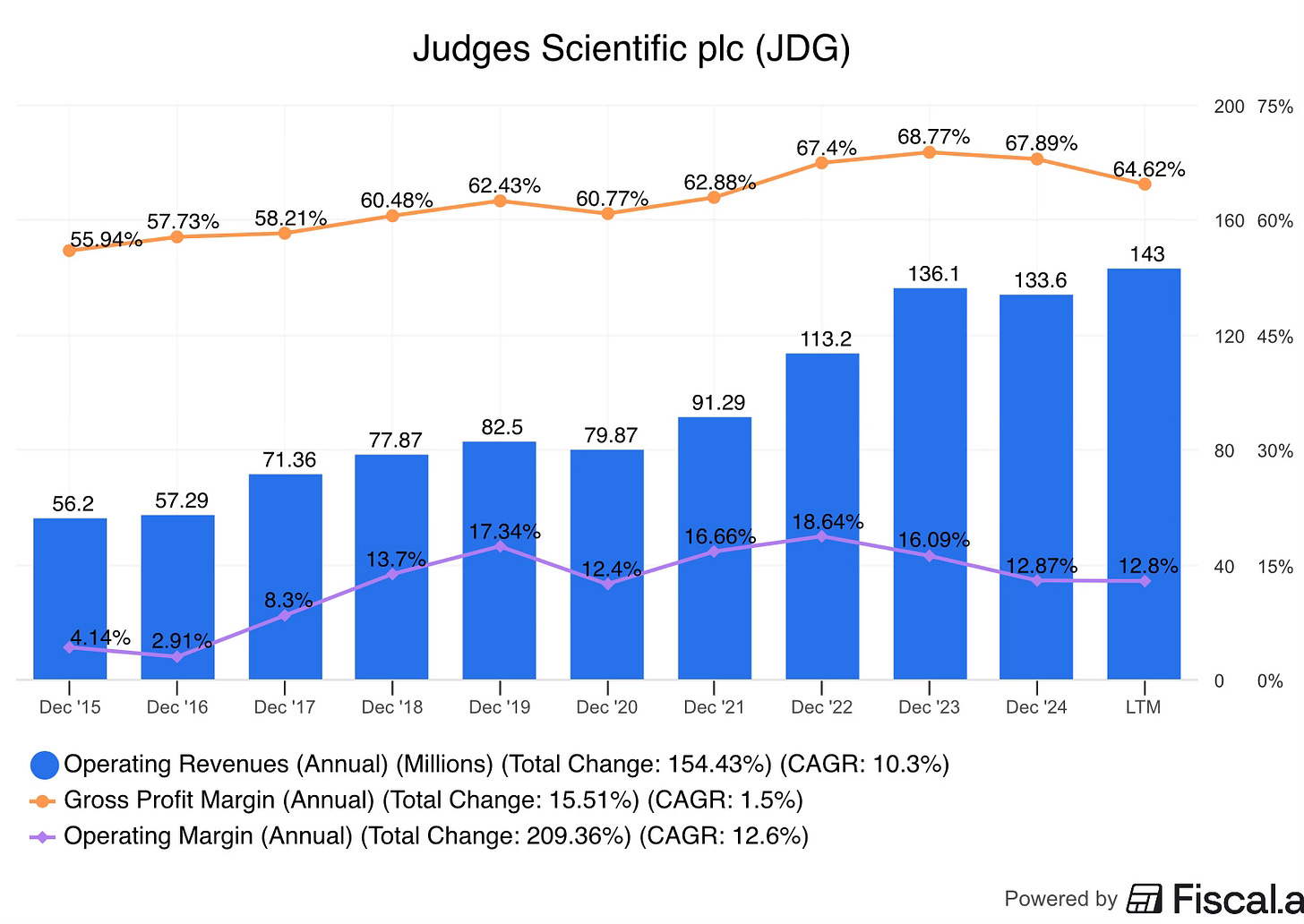 Judges Scientific today is a holding company of 25 businesses within the scientific instrument sector. Combined, these generate attractive financial figures: In 2024, the company delivered £133m of revenue (£5.3m per business on average), 65% gross margins, 12% operating margins, and 17% ROTIC despite experiencing significant macro headwinds that are temporarily impacting revenue growth and profitability.