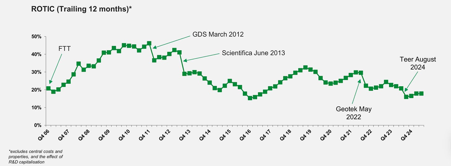 Looking at the financial picture, revenue has slowed but continued to grow, benefiting from several strong years of acquisitions. On the other hand, organic growth has struggled, declining by 8% in 2024 and an additional 7% so far this year. While some of this is a timing issue from the Geotek business, the trend is directionally correct. As a result, profit margins (operating leverage in reverse) and ROTIC have come under pressure.