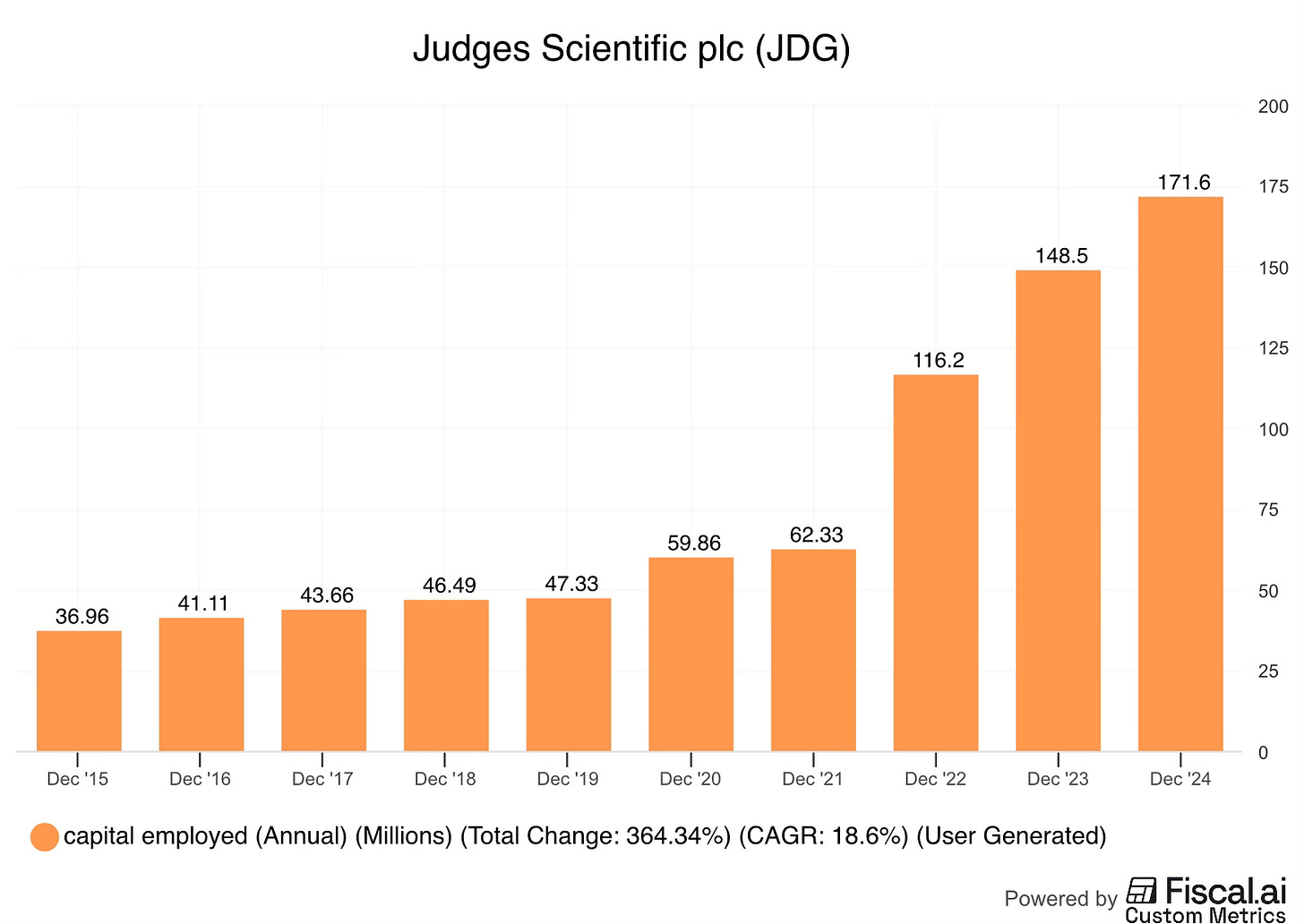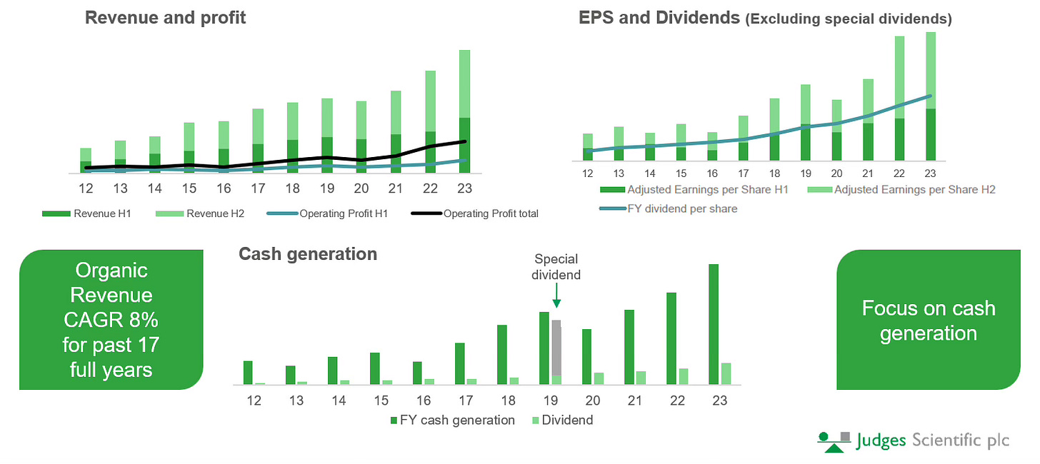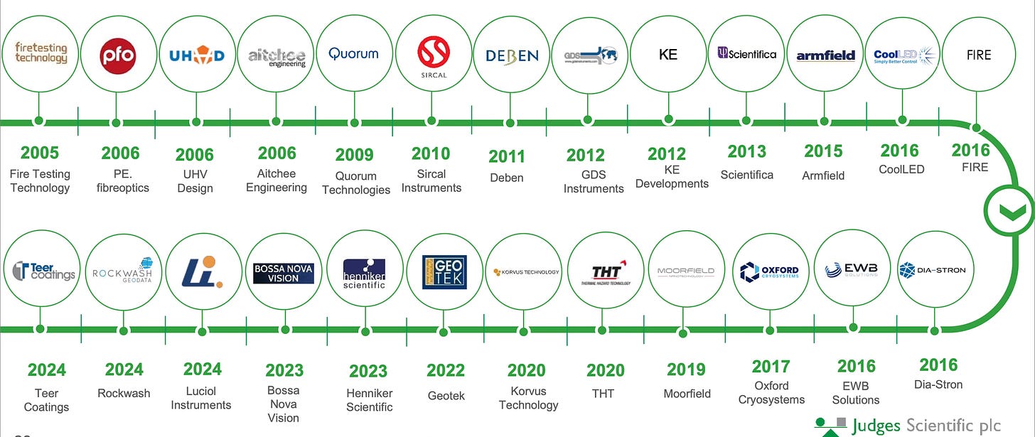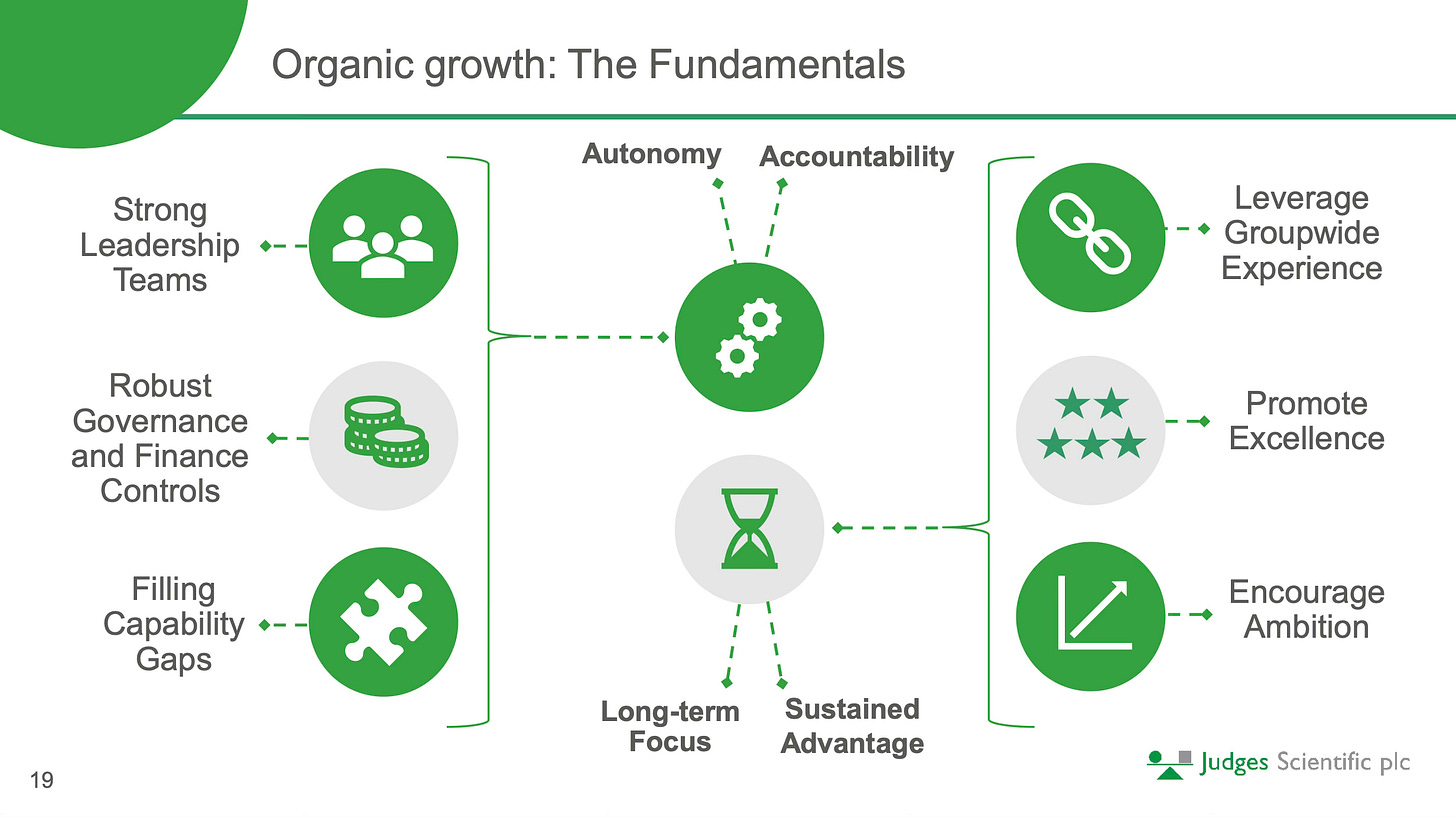 Secular growth tailwinds: Scientific manufacturers have benefited from secular growth trends, such as Worldwide growth in University education and Industrial optimisation, leading to an organic growth rate of 7% annually (8% for Judges). This organic growth reduces the pressure on management to make acquisitions to drive growth, allowing them to be disciplined, increasing the probability of successful deals.