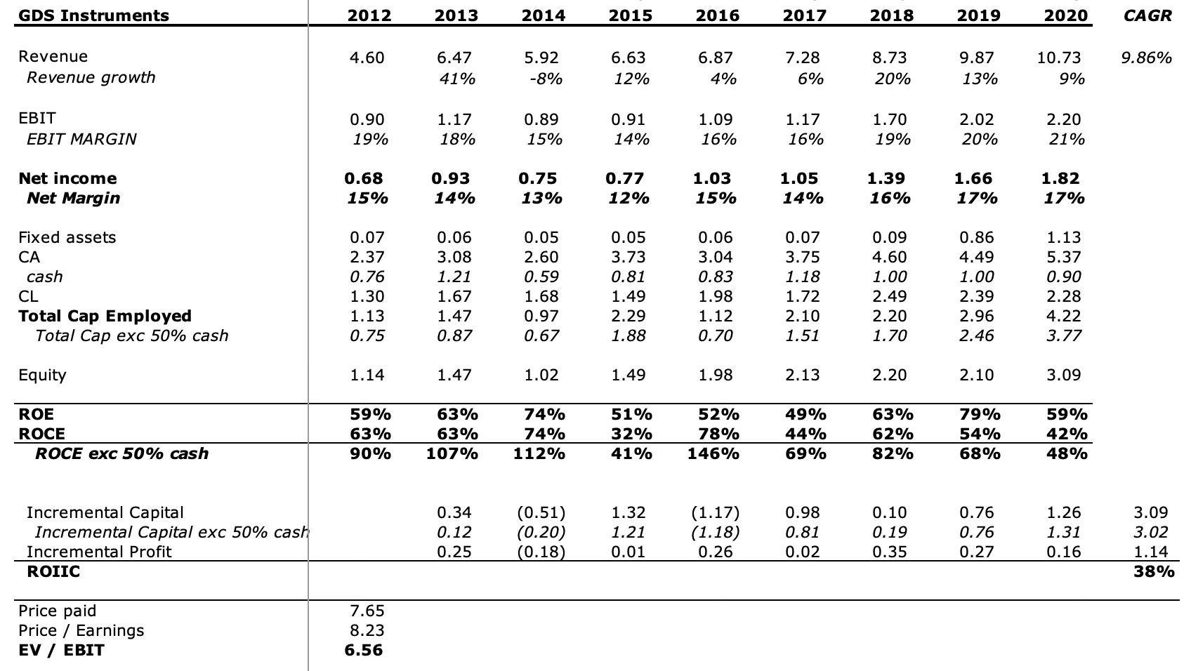 The combination of limited competition, tech advantage, and highly specialised knowledge required allows the individual businesses to earn attractive profits and cash flows (albeit lumpy), typically 25%+ EBIT margins and 30%+ ROTIC, highlighting the underlying quality of each business. Below are the financial statements of subsidiary business GDS Instruments to demonstrate this.